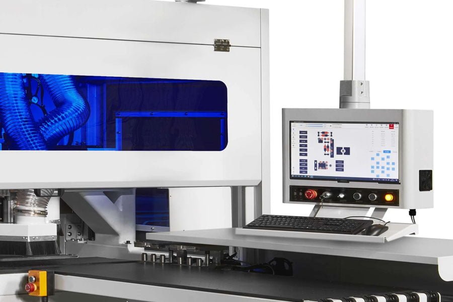 Màn hình thao tác bên phải, 2 kẹp phôi chạy trên thanh trượt được thiết kế dạng dài, 2 cụm khoan và 2 trục router.