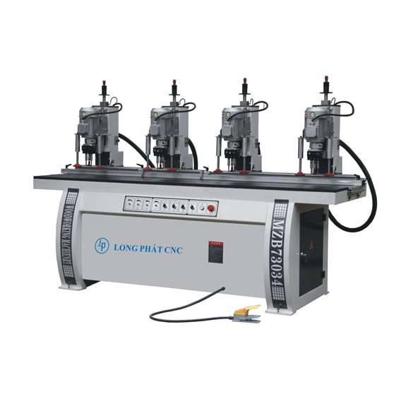 Máy được trang bị 4 đầu khoan, mỗi đầu có 3 mũi khoan, giúp gia công đồng thời nhiều vị trí, tiết kiệm thời gian.